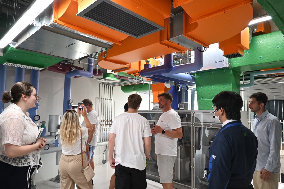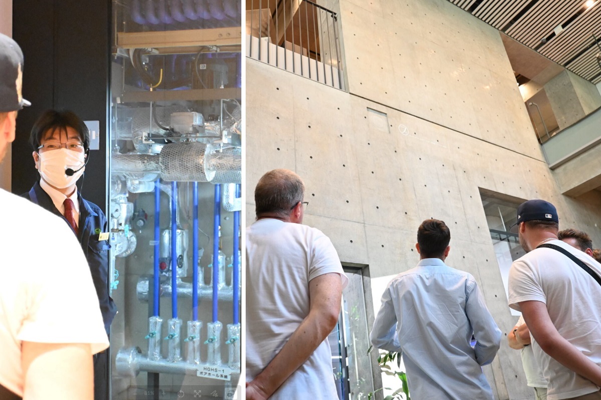 例えばNOTIAでは、少ない電力で建物を涼しくするために、地下100m以上まで配管を通し、地中の冷たい熱によってコンクリート躯体を冷却しています。また、中間期には、季節風を効率よく取り入れ換気に使用できるよう、窓を対角線上に配置するなど、細やかな工夫が施されています。さらに、ダクトは用途ごとに色分けされており、設備機器もスケルトン仕様で内部の仕組みを見られるため、利用者が実際に設備や仕組みを観察しながら学べる環境が整っています。当日の視察では、参加者の皆さまが施設のさまざまな仕掛けや工夫に関心を持ち、積極的に質問をされる姿が見られ、知識を深められていました。